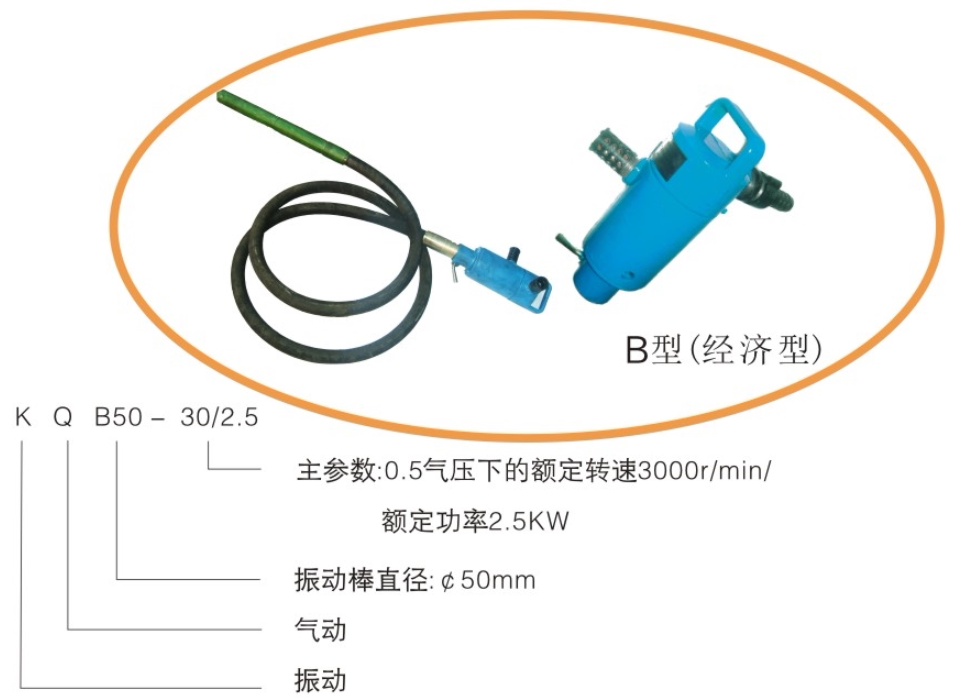 该振动器以压缩空气为动力源采用叶片式气动马达动力大,配用软轴传动的行星式高频振动棒。具有振幅大、频率高、体积小、重量轻、结构合理,安装操作维修方便等优点。在各种特殊工作环境中使用,安全可靠。