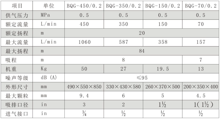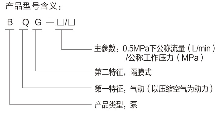 BQG系列气动隔膜泵是以压缩空气为动力,通过换气阀、换向机构以及其它零部件的共同作用实现换向,驱动泵腔内的膜片作往复运动,致使腔内产生压差,从而实现吸排介质的功能。该泵无齿轮、叶片结构,工作不旋转,容许输送含有一定大小颗粒的流体,具有独特的防爆性能。特别适用于煤矿行业的高瓦斯环境,尤其是掘进面排水、排污水作业。该泵在使用过程中,可利用气压或管道上的阀门任意调节流量,甚至可以在目标输送点直接关闭料阀,而不需担心因此而造成损坏水泵。该泵强劲的虹吸能力,无需灌水即可直接启动,亦可潜水作业,是矿排水作业的理想工具。该泵采用模块化设计,体积小、重量轻、可移动、故障率低、维修方便。该系列气动隔膜泵具有良好的安全性、可靠性、高效性和便捷性。 本厂产品0.20.3、0.4、0.5额定气压均适用,符合煤安标准主要性能参数。